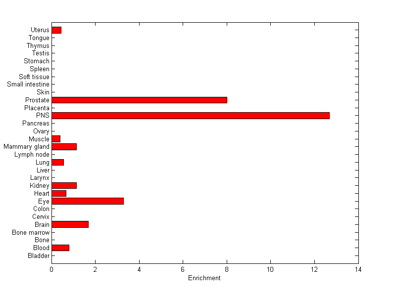 About the profile: The expression level is normalized with tissue-library size. Each value for a gene in a tissue is a ratio of observed ESTs to the expected one in this tissue. The expected number of ESTs is the product of total ESTs of the gene and the fraction of total ESTs in the tissue among all ESTs in 30 tissues. Summary: This gene is preferentially expressed in [peripheral_nervous_system, prostate] Download: |