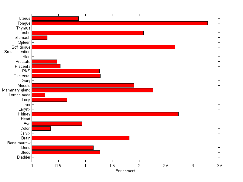 The expression level is normalized with tissue-library size. Each value for a gene in a tissue is a ratio of observed ESTs to the expected one in this tissue. The expected number of ESTs is the product of total ESTs of the gene and the fraction of total ESTs in the tissue among all ESTs in 30 tissues.