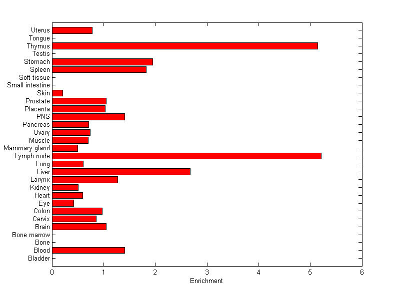 The expression level is normalized with tissue-library size. Each value for a gene in a tissue is a ratio of observed ESTs to the expected one in this tissue. The expected number of ESTs is the product of total ESTs of the gene and the fraction of total ESTs in the tissue among all ESTs in 30 tissues.