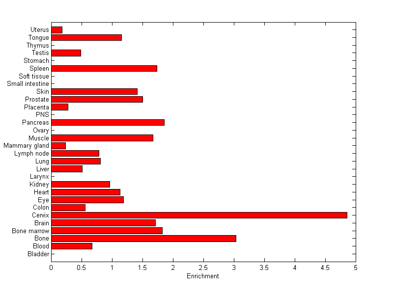 The expression level is normalized with tissue-library size. Each value for a gene in a tissue is a ratio of observed ESTs to the expected one in this tissue. The expected number of ESTs is the product of total ESTs of the gene and the fraction of total ESTs in the tissue among all ESTs in 30 tissues.