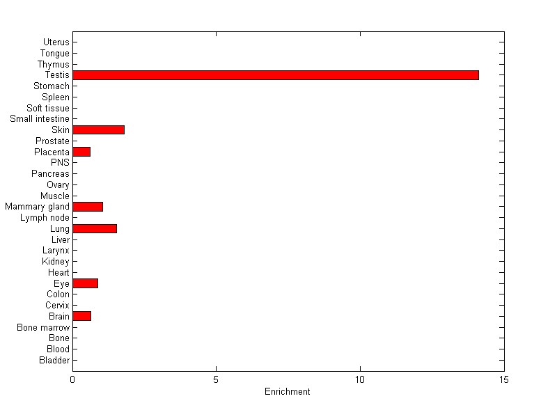 The expression level is normalized with tissue-library size. Each value for a gene in a tissue is a ratio of observed ESTs to the expected one in this tissue. The expected number of ESTs is the product of total ESTs of the gene and the fraction of total ESTs in the tissue among all ESTs in 30 tissues.