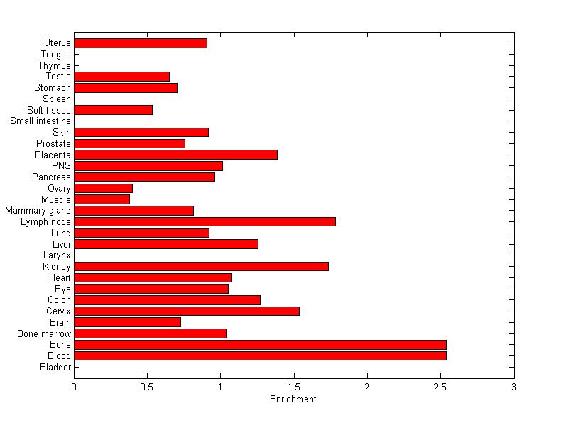 The expression level is normalized with tissue-library size. Each value for a gene in a tissue is a ratio of observed ESTs to the expected one in this tissue. The expected number of ESTs is the product of total ESTs of the gene and the fraction of total ESTs in the tissue among all ESTs in 30 tissues.