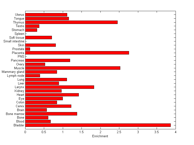 The expression level is normalized with tissue-library size. Each value for a gene in a tissue is a ratio of observed ESTs to the expected one in this tissue. The expected number of ESTs is the product of total ESTs of the gene and the fraction of total ESTs in the tissue among all ESTs in 30 tissues.