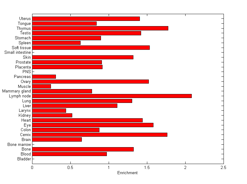 The expression level is normalized with tissue-library size. Each value for a gene in a tissue is a ratio of observed ESTs to the expected one in this tissue. The expected number of ESTs is the product of total ESTs of the gene and the fraction of total ESTs in the tissue among all ESTs in 30 tissues.