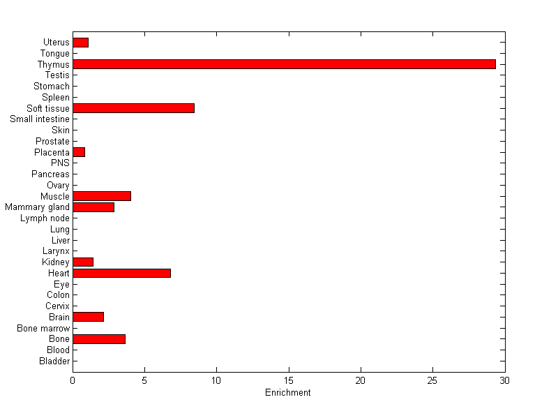 The expression level is normalized with tissue-library size. Each value for a gene in a tissue is a ratio of observed ESTs to the expected one in this tissue. The expected number of ESTs is the product of total ESTs of the gene and the fraction of total ESTs in the tissue among all ESTs in 30 tissues.