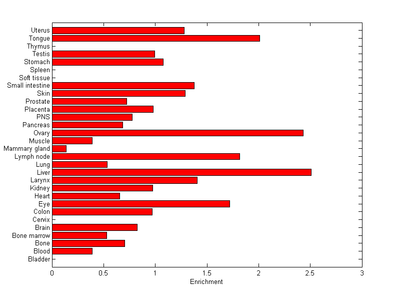 The expression level is normalized with tissue-library size. Each value for a gene in a tissue is a ratio of observed ESTs to the expected one in this tissue. The expected number of ESTs is the product of total ESTs of the gene and the fraction of total ESTs in the tissue among all ESTs in 30 tissues.