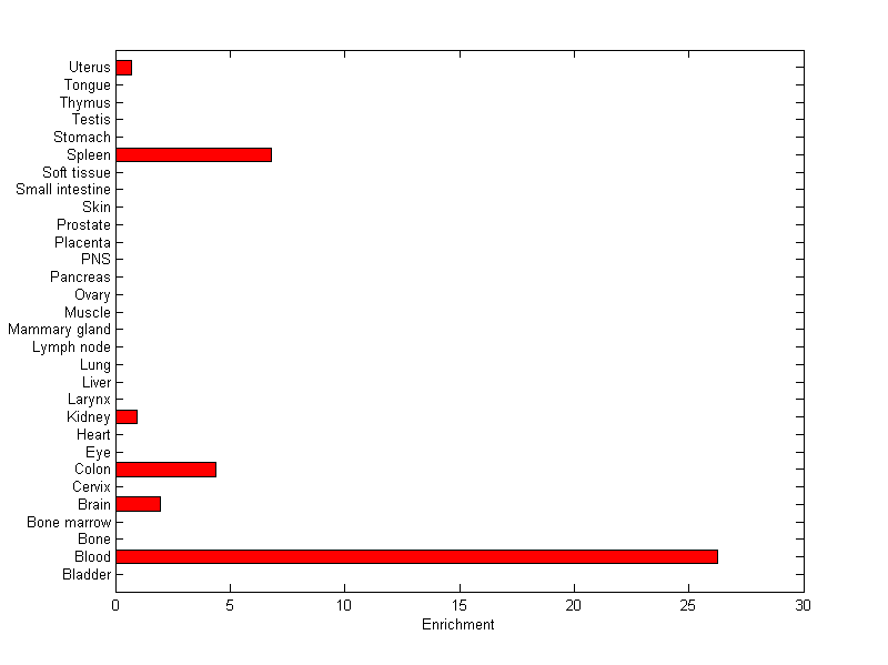 The expression level is normalized with tissue-library size. Each value for a gene in a tissue is a ratio of observed ESTs to the expected one in this tissue. The expected number of ESTs is the product of total ESTs of the gene and the fraction of total ESTs in the tissue among all ESTs in 30 tissues.