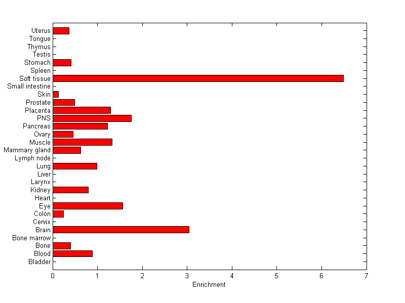 The expression level is normalized with tissue-library size. Each value for a gene in a tissue is a ratio of observed ESTs to the expected one in this tissue. The expected number of ESTs is the product of total ESTs of the gene and the fraction of total ESTs in the tissue among all ESTs in 30 tissues.