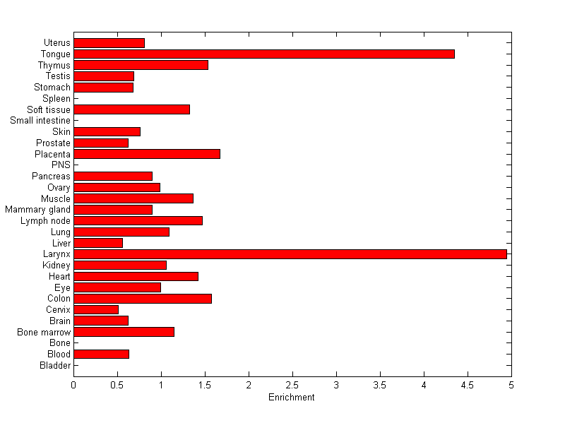 The expression level is normalized with tissue-library size. Each value for a gene in a tissue is a ratio of observed ESTs to the expected one in this tissue. The expected number of ESTs is the product of total ESTs of the gene and the fraction of total ESTs in the tissue among all ESTs in 30 tissues.