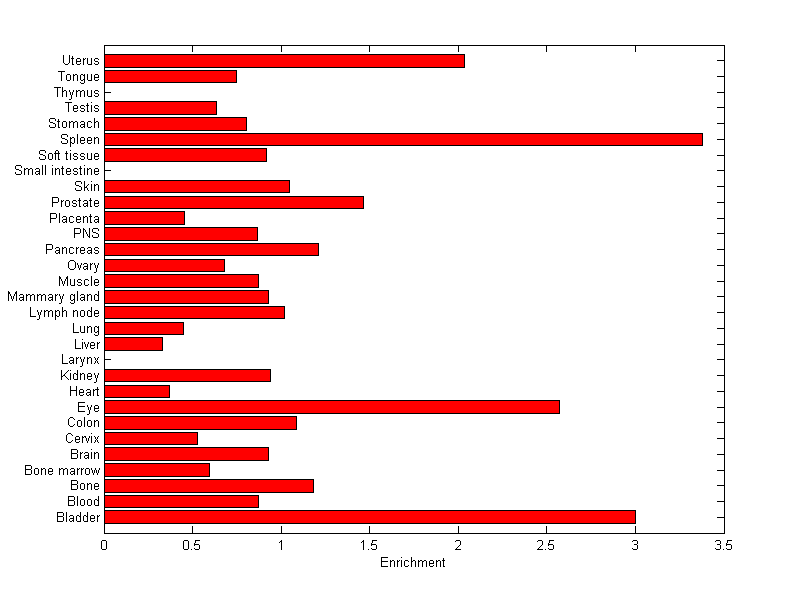 The expression level is normalized with tissue-library size. Each value for a gene in a tissue is a ratio of observed ESTs to the expected one in this tissue. The expected number of ESTs is the product of total ESTs of the gene and the fraction of total ESTs in the tissue among all ESTs in 30 tissues.