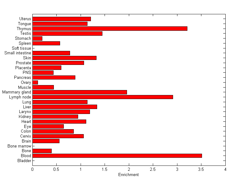 The expression level is normalized with tissue-library size. Each value for a gene in a tissue is a ratio of observed ESTs to the expected one in this tissue. The expected number of ESTs is the product of total ESTs of the gene and the fraction of total ESTs in the tissue among all ESTs in 30 tissues.
