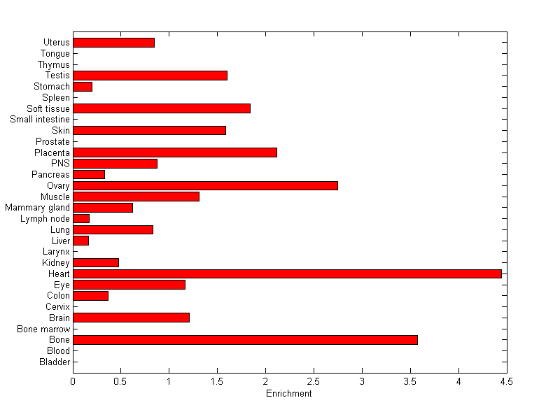 The expression level is normalized with tissue-library size. Each value for a gene in a tissue is a ratio of observed ESTs to the expected one in this tissue. The expected number of ESTs is the product of total ESTs of the gene and the fraction of total ESTs in the tissue among all ESTs in 30 tissues.