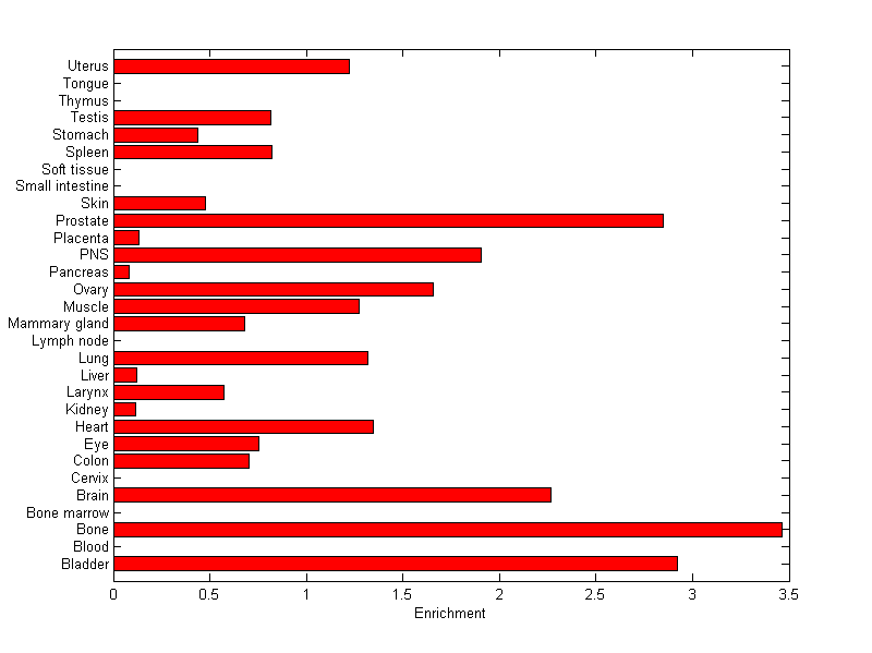 The expression level is normalized with tissue-library size. Each value for a gene in a tissue is a ratio of observed ESTs to the expected one in this tissue. The expected number of ESTs is the product of total ESTs of the gene and the fraction of total ESTs in the tissue among all ESTs in 30 tissues.