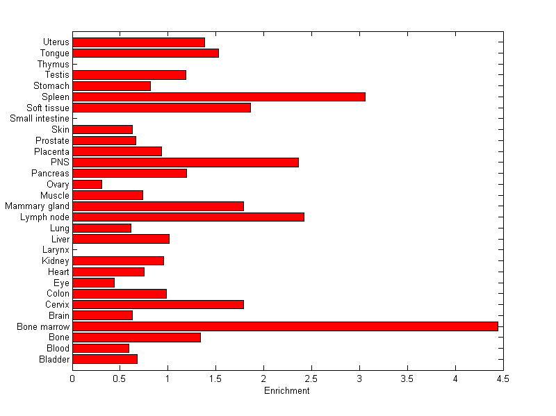 The expression level is normalized with tissue-library size. Each value for a gene in a tissue is a ratio of observed ESTs to the expected one in this tissue. The expected number of ESTs is the product of total ESTs of the gene and the fraction of total ESTs in the tissue among all ESTs in 30 tissues.