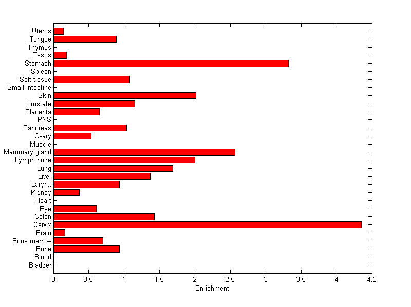 The expression level is normalized with tissue-library size. Each value for a gene in a tissue is a ratio of observed ESTs to the expected one in this tissue. The expected number of ESTs is the product of total ESTs of the gene and the fraction of total ESTs in the tissue among all ESTs in 30 tissues.