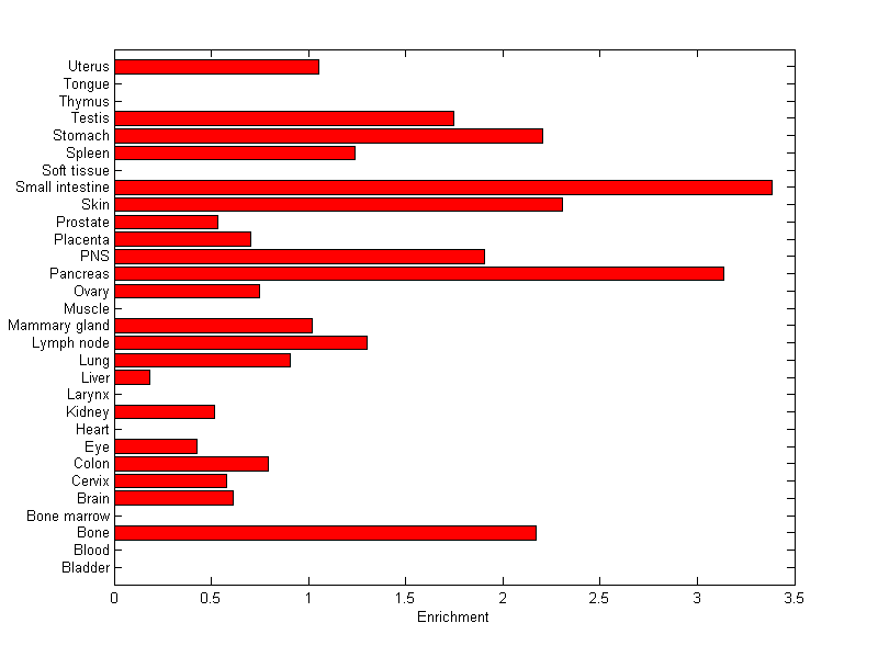 The expression level is normalized with tissue-library size. Each value for a gene in a tissue is a ratio of observed ESTs to the expected one in this tissue. The expected number of ESTs is the product of total ESTs of the gene and the fraction of total ESTs in the tissue among all ESTs in 30 tissues.
