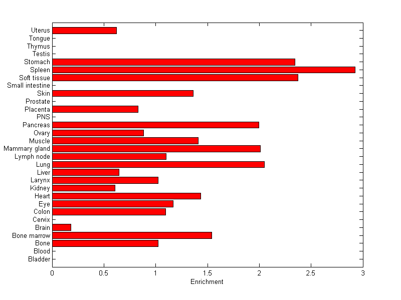 The expression level is normalized with tissue-library size. Each value for a gene in a tissue is a ratio of observed ESTs to the expected one in this tissue. The expected number of ESTs is the product of total ESTs of the gene and the fraction of total ESTs in the tissue among all ESTs in 30 tissues.