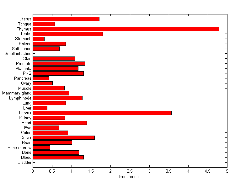 The expression level is normalized with tissue-library size. Each value for a gene in a tissue is a ratio of observed ESTs to the expected one in this tissue. The expected number of ESTs is the product of total ESTs of the gene and the fraction of total ESTs in the tissue among all ESTs in 30 tissues.