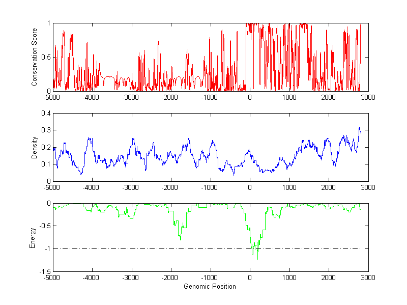 The energy profile (green curve) is about energy for module detection based on TF interaction. The positions with energy less than -1 indicate the existence of CRMs.