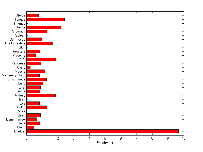 The expression level is normalized with tissue-library size. Each value for a gene in a tissue is a ratio of observed ESTs to the expected one in this tissue. The expected number of ESTs is the product of total ESTs of the gene and the fraction of total ESTs in the tissue among all ESTs in 30 tissues.