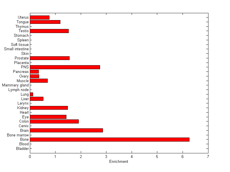 The expression level is normalized with tissue-library size. Each value for a gene in a tissue is a ratio of observed ESTs to the expected one in this tissue. The expected number of ESTs is the product of total ESTs of the gene and the fraction of total ESTs in the tissue among all ESTs in 30 tissues.
