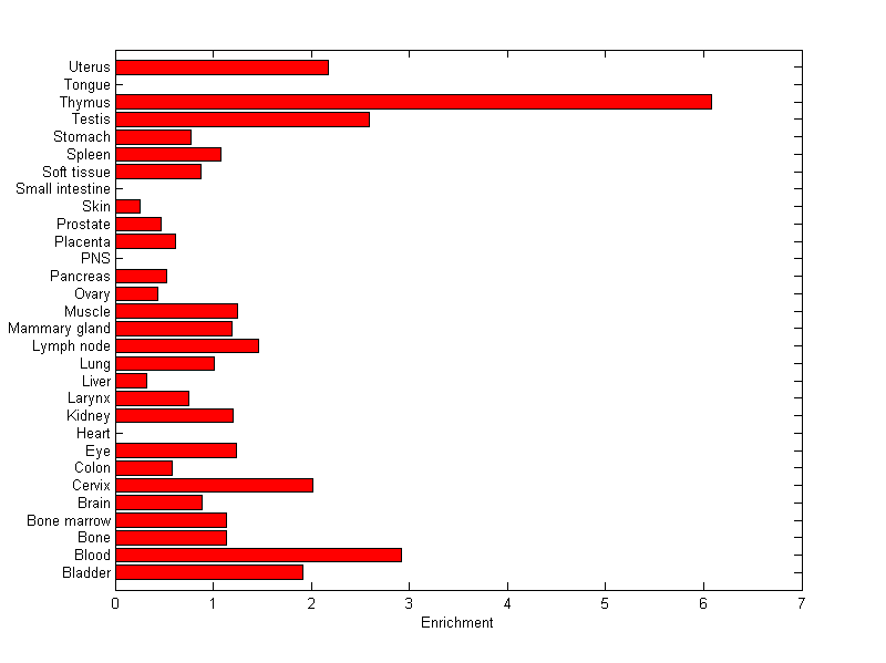 The expression level is normalized with tissue-library size. Each value for a gene in a tissue is a ratio of observed ESTs to the expected one in this tissue. The expected number of ESTs is the product of total ESTs of the gene and the fraction of total ESTs in the tissue among all ESTs in 30 tissues.