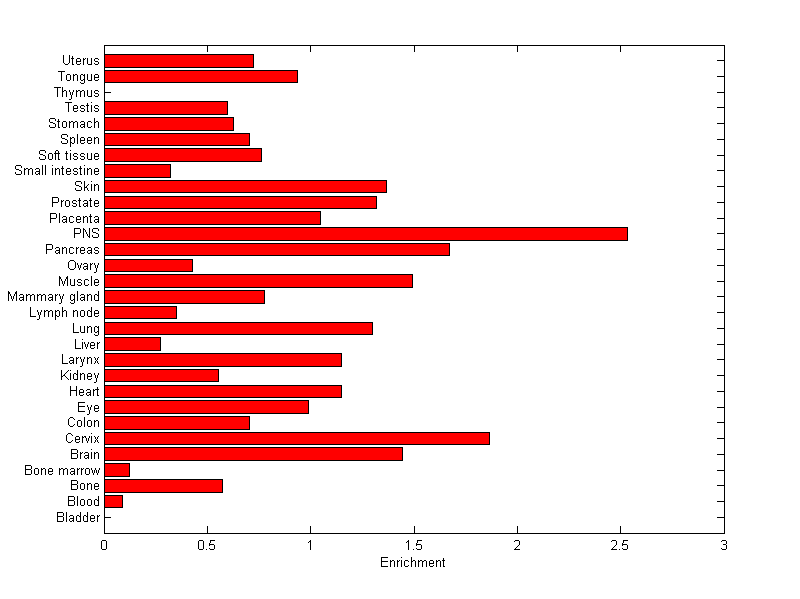 The expression level is normalized with tissue-library size. Each value for a gene in a tissue is a ratio of observed ESTs to the expected one in this tissue. The expected number of ESTs is the product of total ESTs of the gene and the fraction of total ESTs in the tissue among all ESTs in 30 tissues.