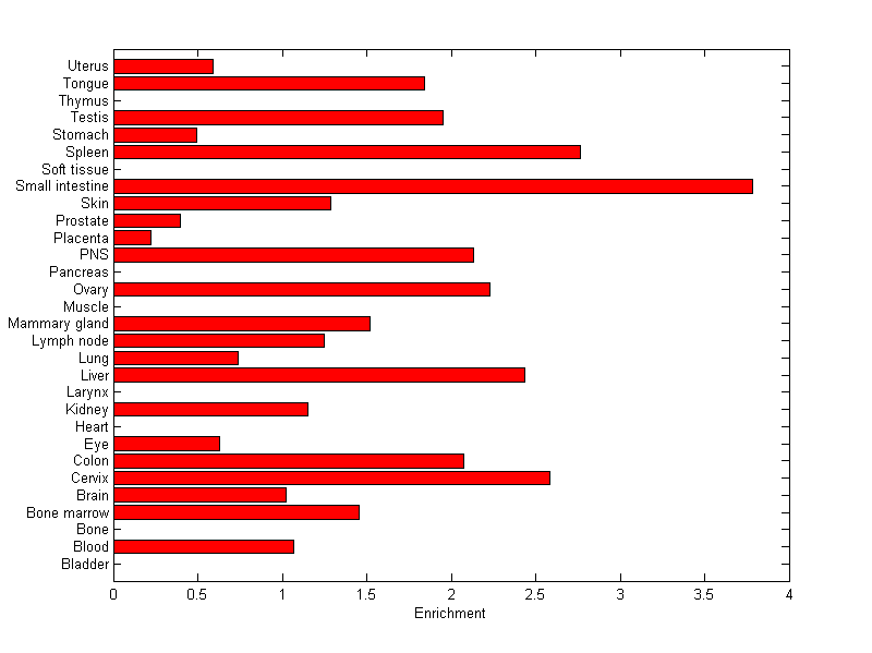 The expression level is normalized with tissue-library size. Each value for a gene in a tissue is a ratio of observed ESTs to the expected one in this tissue. The expected number of ESTs is the product of total ESTs of the gene and the fraction of total ESTs in the tissue among all ESTs in 30 tissues.
