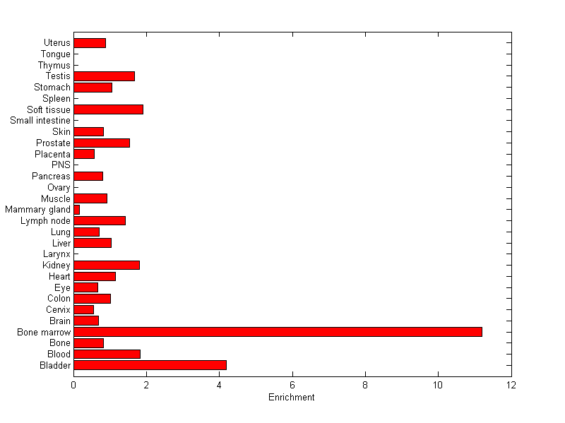 The expression level is normalized with tissue-library size. Each value for a gene in a tissue is a ratio of observed ESTs to the expected one in this tissue. The expected number of ESTs is the product of total ESTs of the gene and the fraction of total ESTs in the tissue among all ESTs in 30 tissues.