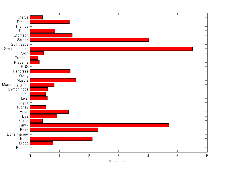 The expression level is normalized with tissue-library size. Each value for a gene in a tissue is a ratio of observed ESTs to the expected one in this tissue. The expected number of ESTs is the product of total ESTs of the gene and the fraction of total ESTs in the tissue among all ESTs in 30 tissues.