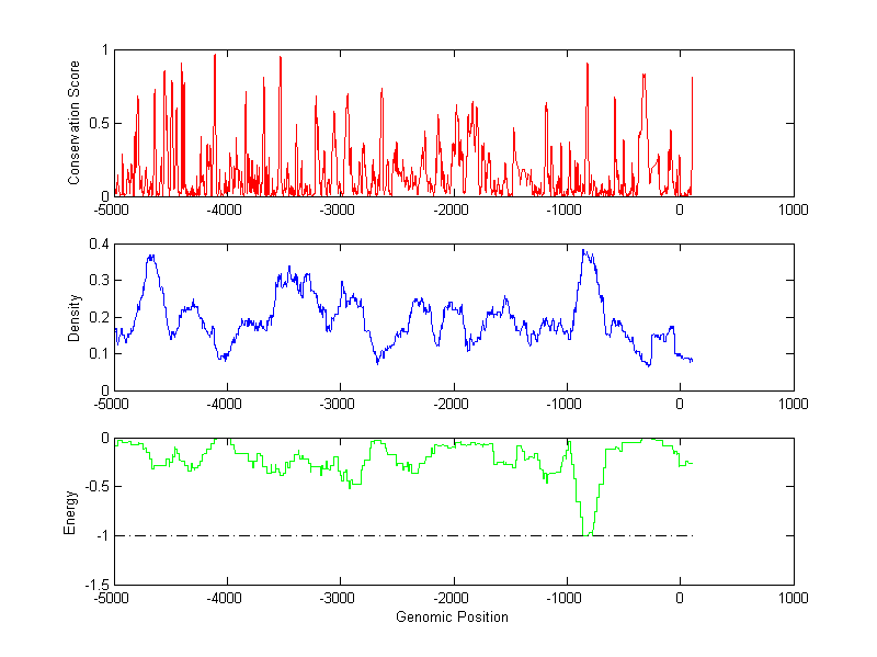 The energy profile (green curve) is about energy for module detection based on TF interaction. The positions with energy less than -1 indicate the existence of CRMs.