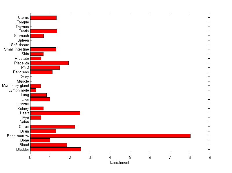 The expression level is normalized with tissue-library size. Each value for a gene in a tissue is a ratio of observed ESTs to the expected one in this tissue. The expected number of ESTs is the product of total ESTs of the gene and the fraction of total ESTs in the tissue among all ESTs in 30 tissues.