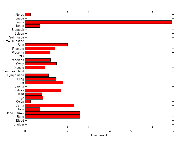 The expression level is normalized with tissue-library size. Each value for a gene in a tissue is a ratio of observed ESTs to the expected one in this tissue. The expected number of ESTs is the product of total ESTs of the gene and the fraction of total ESTs in the tissue among all ESTs in 30 tissues.