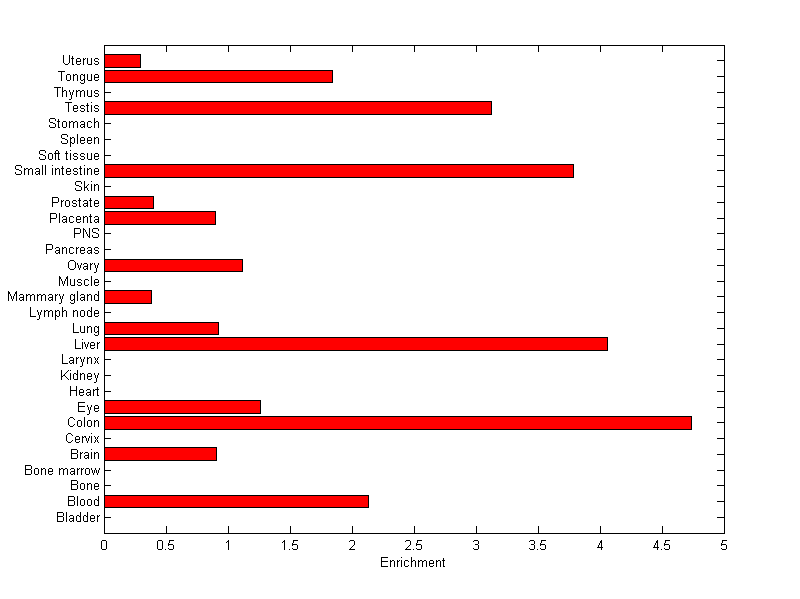 The expression level is normalized with tissue-library size. Each value for a gene in a tissue is a ratio of observed ESTs to the expected one in this tissue. The expected number of ESTs is the product of total ESTs of the gene and the fraction of total ESTs in the tissue among all ESTs in 30 tissues.