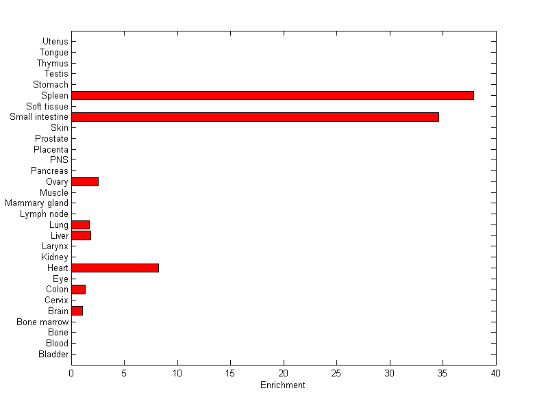 The expression level is normalized with tissue-library size. Each value for a gene in a tissue is a ratio of observed ESTs to the expected one in this tissue. The expected number of ESTs is the product of total ESTs of the gene and the fraction of total ESTs in the tissue among all ESTs in 30 tissues.