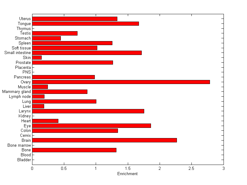 The expression level is normalized with tissue-library size. Each value for a gene in a tissue is a ratio of observed ESTs to the expected one in this tissue. The expected number of ESTs is the product of total ESTs of the gene and the fraction of total ESTs in the tissue among all ESTs in 30 tissues.