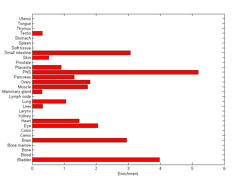 The expression level is normalized with tissue-library size. Each value for a gene in a tissue is a ratio of observed ESTs to the expected one in this tissue. The expected number of ESTs is the product of total ESTs of the gene and the fraction of total ESTs in the tissue among all ESTs in 30 tissues.