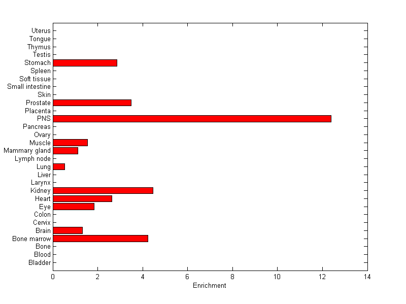 The expression level is normalized with tissue-library size. Each value for a gene in a tissue is a ratio of observed ESTs to the expected one in this tissue. The expected number of ESTs is the product of total ESTs of the gene and the fraction of total ESTs in the tissue among all ESTs in 30 tissues.