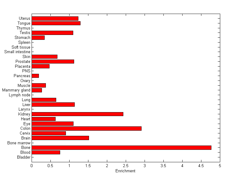 The expression level is normalized with tissue-library size. Each value for a gene in a tissue is a ratio of observed ESTs to the expected one in this tissue. The expected number of ESTs is the product of total ESTs of the gene and the fraction of total ESTs in the tissue among all ESTs in 30 tissues.