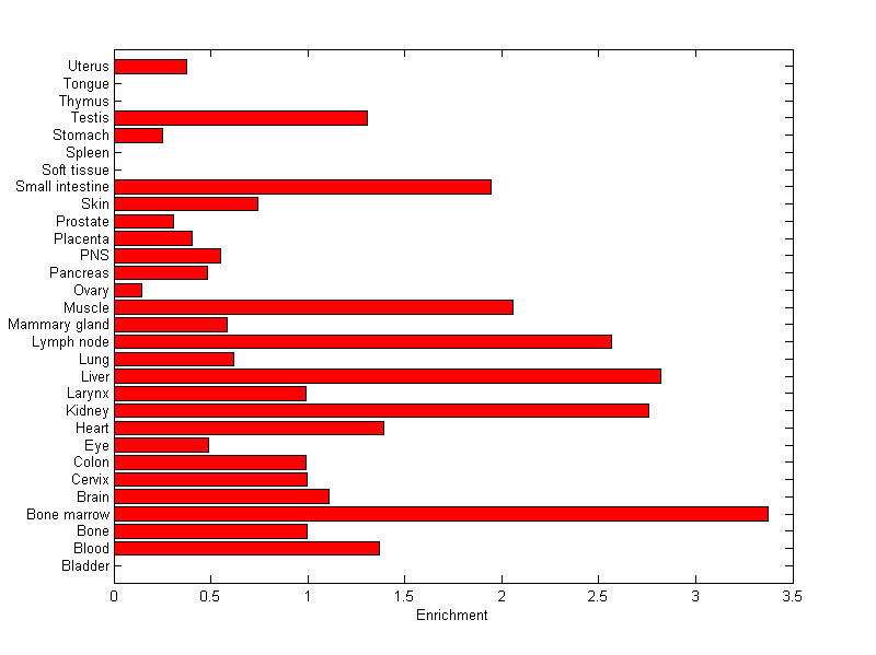 The expression level is normalized with tissue-library size. Each value for a gene in a tissue is a ratio of observed ESTs to the expected one in this tissue. The expected number of ESTs is the product of total ESTs of the gene and the fraction of total ESTs in the tissue among all ESTs in 30 tissues.
