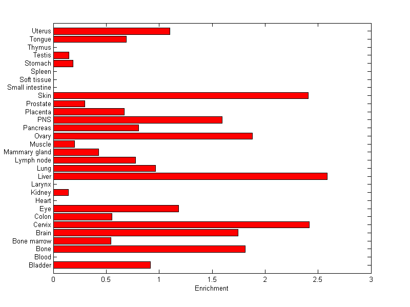 The expression level is normalized with tissue-library size. Each value for a gene in a tissue is a ratio of observed ESTs to the expected one in this tissue. The expected number of ESTs is the product of total ESTs of the gene and the fraction of total ESTs in the tissue among all ESTs in 30 tissues.