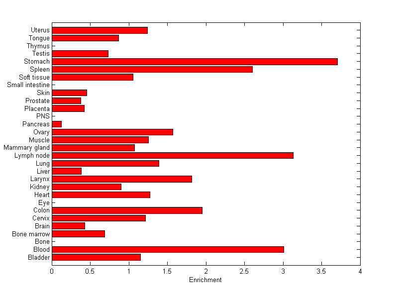 The expression level is normalized with tissue-library size. Each value for a gene in a tissue is a ratio of observed ESTs to the expected one in this tissue. The expected number of ESTs is the product of total ESTs of the gene and the fraction of total ESTs in the tissue among all ESTs in 30 tissues.