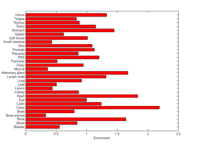 The expression level is normalized with tissue-library size. Each value for a gene in a tissue is a ratio of observed ESTs to the expected one in this tissue. The expected number of ESTs is the product of total ESTs of the gene and the fraction of total ESTs in the tissue among all ESTs in 30 tissues.