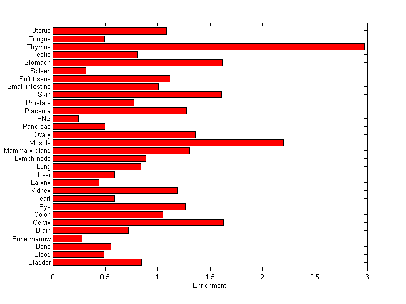 The expression level is normalized with tissue-library size. Each value for a gene in a tissue is a ratio of observed ESTs to the expected one in this tissue. The expected number of ESTs is the product of total ESTs of the gene and the fraction of total ESTs in the tissue among all ESTs in 30 tissues.