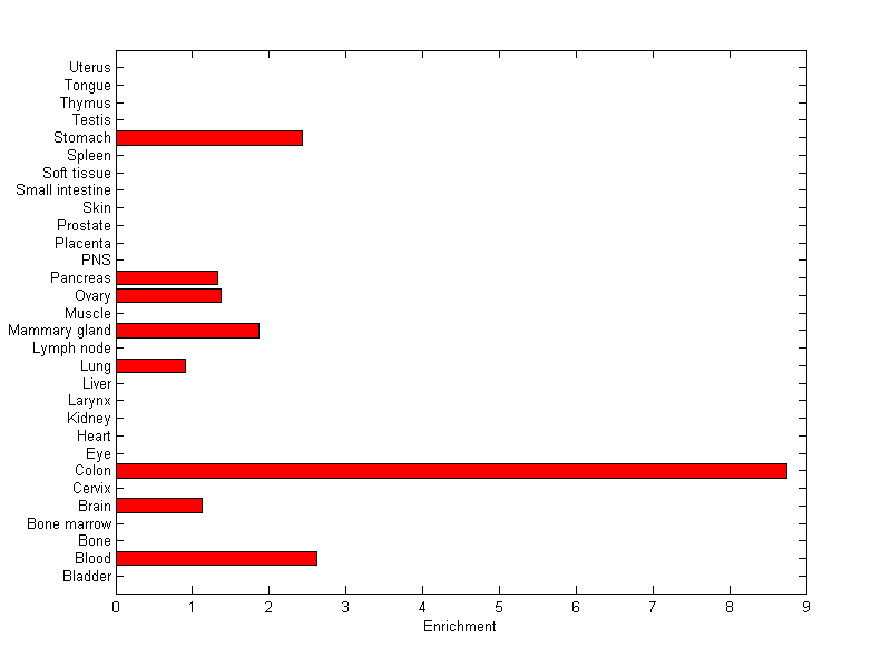The expression level is normalized with tissue-library size. Each value for a gene in a tissue is a ratio of observed ESTs to the expected one in this tissue. The expected number of ESTs is the product of total ESTs of the gene and the fraction of total ESTs in the tissue among all ESTs in 30 tissues.