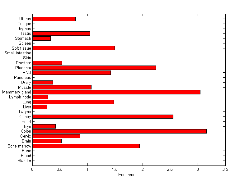 The expression level is normalized with tissue-library size. Each value for a gene in a tissue is a ratio of observed ESTs to the expected one in this tissue. The expected number of ESTs is the product of total ESTs of the gene and the fraction of total ESTs in the tissue among all ESTs in 30 tissues.