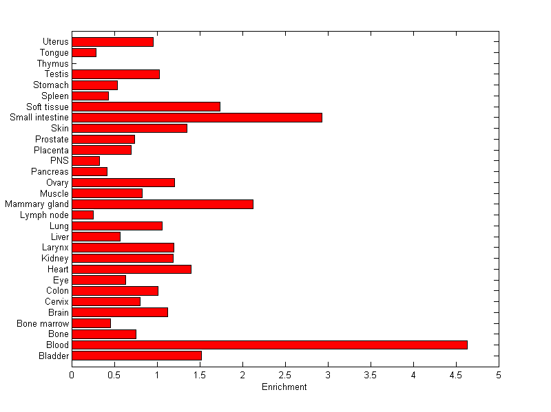 The expression level is normalized with tissue-library size. Each value for a gene in a tissue is a ratio of observed ESTs to the expected one in this tissue. The expected number of ESTs is the product of total ESTs of the gene and the fraction of total ESTs in the tissue among all ESTs in 30 tissues.