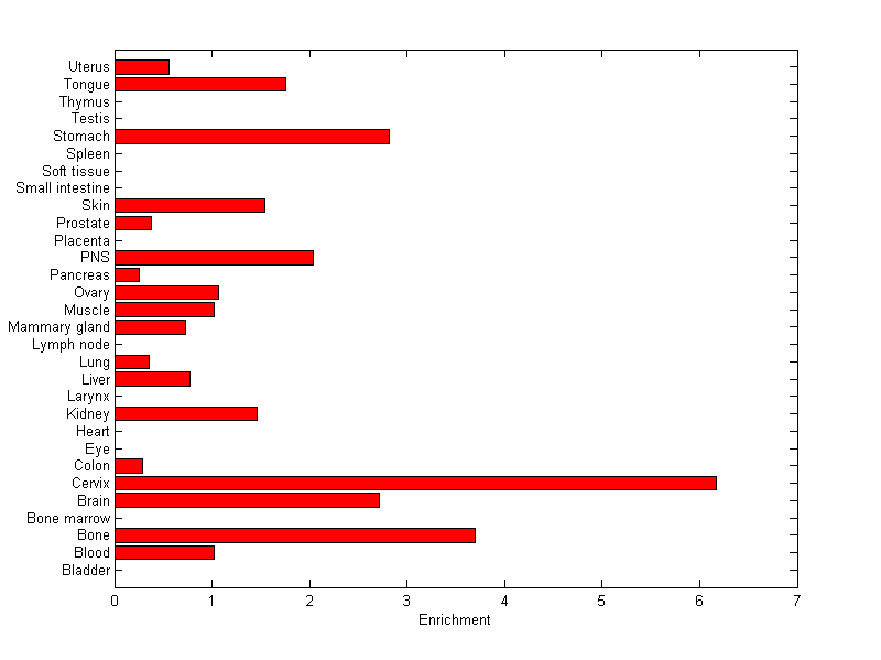 The expression level is normalized with tissue-library size. Each value for a gene in a tissue is a ratio of observed ESTs to the expected one in this tissue. The expected number of ESTs is the product of total ESTs of the gene and the fraction of total ESTs in the tissue among all ESTs in 30 tissues.