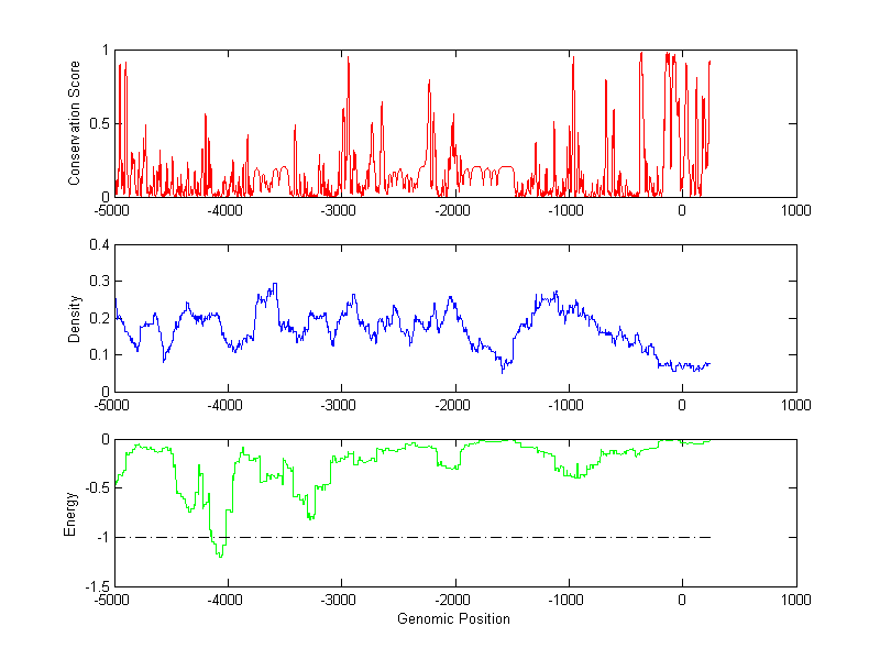 About the profiles: The conservation profile (red curve) is about conservation scores of the promoter sequences. Conservation was determined from an eight-way alignment of human, chimpanzee, dog, mouse, rat, chicken, zebrafish and fugu sequences. The conservation was quantified by a conservation score between 0 and 1, with 1 as highest conservation. The conservation score was obtained from UCSC genome databases. The density profile (blue curve) is about density of all TF binding sites. The energy profile (green curve) is about energy for module detection based on TF interaction. The positions with energy less than -1 indicate the existence of CRMs. Download: Conservation profileDensity profile Energy profile CRM summary |