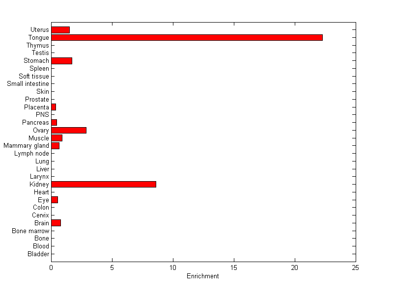 About the profile: The expression level is normalized with tissue-library size. Each value for a gene in a tissue is a ratio of observed ESTs to the expected one in this tissue. The expected number of ESTs is the product of total ESTs of the gene and the fraction of total ESTs in the tissue among all ESTs in 30 tissues. Summary: This gene is preferentially expressed in [kidney, tongue] Download: |